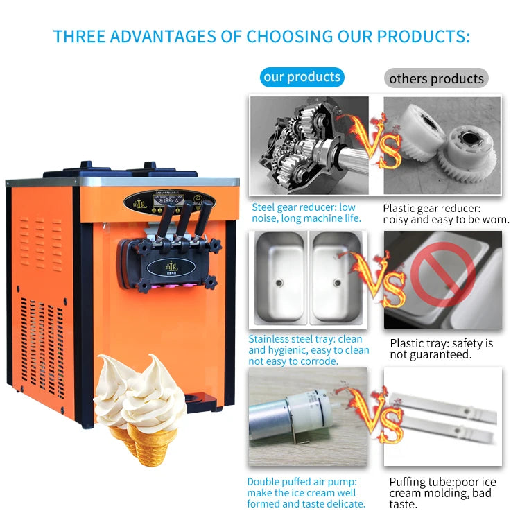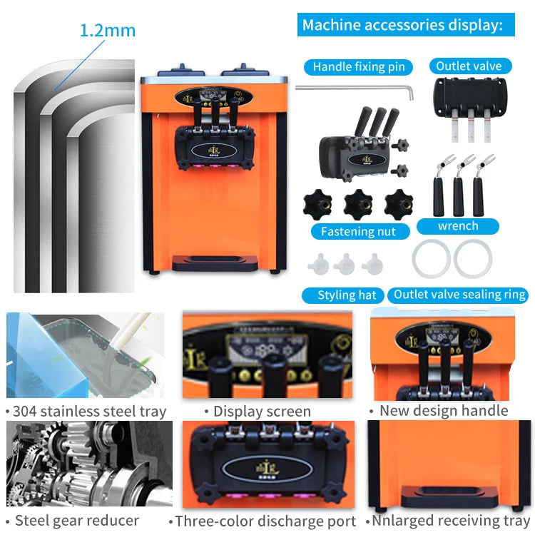 * 3 Flavors(2+mixer) soft ice cream machine, 220V50HZ, 2000W(can be customerized). Auto washing,auto counting function.